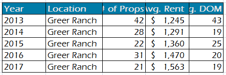 The numbers that follow compare full year rental property market data from 2013-2017 in Greer Ranch and Surprise, AZ. The number of rental properties analyzed is simulated for 2017 based the rental market data through 9-30-2017.